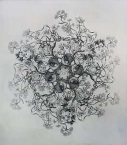 Eden Gard’s practice focuses on the intersections of science, magic, and occultism; She has a passion for exploring soft sciences and how they interact with societal or cultural beliefs. She often works with motifs of alchemy and witchcraft to deconstruct and reimagine concepts like chaos theory and human psychology. Doing this she aims to create a commentary on how the mind, body and soul interact with the wider universe as we understand it, and the rituals we use to try and define our place in what is undefinable.
