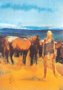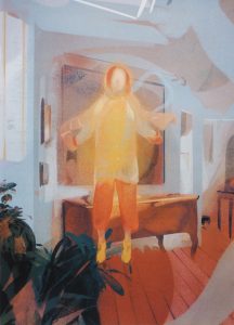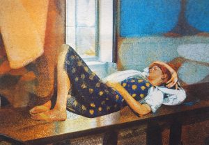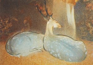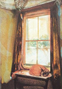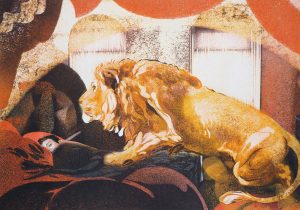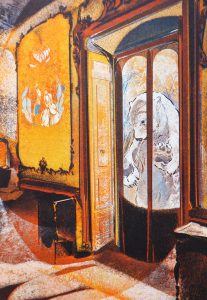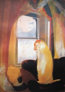 As a printmaker Georgia uses her art to unravel the interiors she moves through and lives within. She dissolves and dramatises everyday rooms and corridors, questioning notions of intimacy, belonging and confinement through the glaze of domesticity. Enclosed by these scenes Georgia is drawn into the warmth of her childhood; filling empty rooms with colourful figures and animals she collects from children’s books, novels, poetry, films and dreams. In these painterly reveries memories and imagination start to overlap playfully, illuminating the chimerical tangle of curiosity and longing that prompts each artwork.