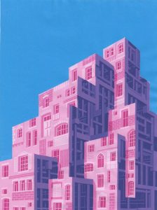 Ioana Pioaru is a U.K.-based Romanian artist, researcher and illustrator, working with a variety of media such as drawing, printmaking, 3d printing, virtual reality painting and digital holography. Her recent projects explore the boundary between drawing and sculpture and the capacity of isometric perspective to generate optical illusions. Her artworks consist mainly of maximalist imagery – pseudo-realistic machinery and eerie architectural structures.