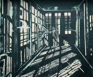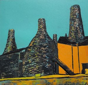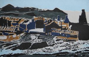 Her Lino Prints begin by looking at the shape and forms around and within the buildings and printing blocks of colour to represent the shapes. With each layer of colour the image gradually emerges.