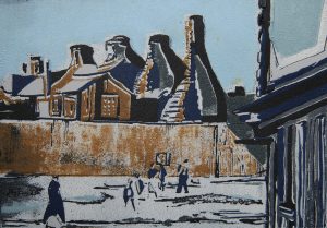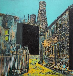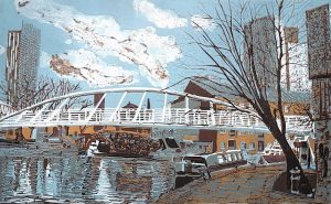 Her current work comprises of a series of urban landscapes. She has a particular interest in the contrast between old functional buildings such as mills and warehouses which are often re-invented for modern use, and historic landmarks alongside sharp, modern architecture. Her work begins with a series of photographs and drawings of the places which she chooses as her landscapes and then studies and works on them later to select to use in a print.