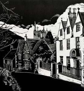 My poems have been appearing in literary magazines and in the national press for some thirty years. I came late to printmaking. Born in Bethesda, North Wales, I grew up in Reading, England, took fine art at school, trained as an architect at the Welsh School of Architecture, and later rarely practised art. I went into architectural history and social work; I trained as a teacher at the University of London and at Aberystwyth University, and did research in discourse analysis at Aston University. Mostly I worked with student writers. I came upon printmaking when I lost my job at the tail end of the pandemic. Cutting and pulling my first print was revelatory: I felt I had come upon something lost long ago and deep within myself. I keep digging.