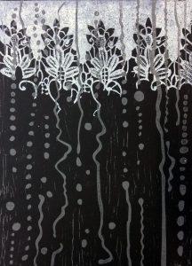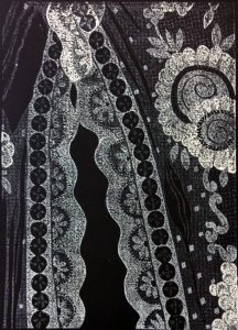 The prints were made by printing a textured base onto black Rives paper and then overprinted using different layers of transparent ink using the ”Reduction” technique. This achieves different qualities of white.