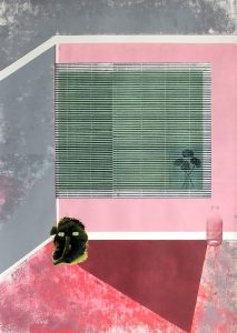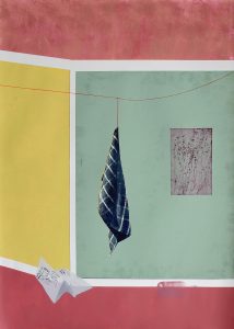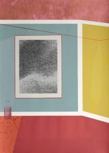 Through multiple print processes Wardski creates fictitious interiors housed within an imagined landscape. Painterly surreal rooms and objects, distorted in scale, evoke loss and abandonment. The lightness of photolithography put through an etching press creates a ghost-like quality suggesting what is past. In contrast, the heavy graphic quality of screen-printing allows me to insert and overlay bold objects as motifs; these then speak a language of a decorative nature, creating a false sense of familiarity.