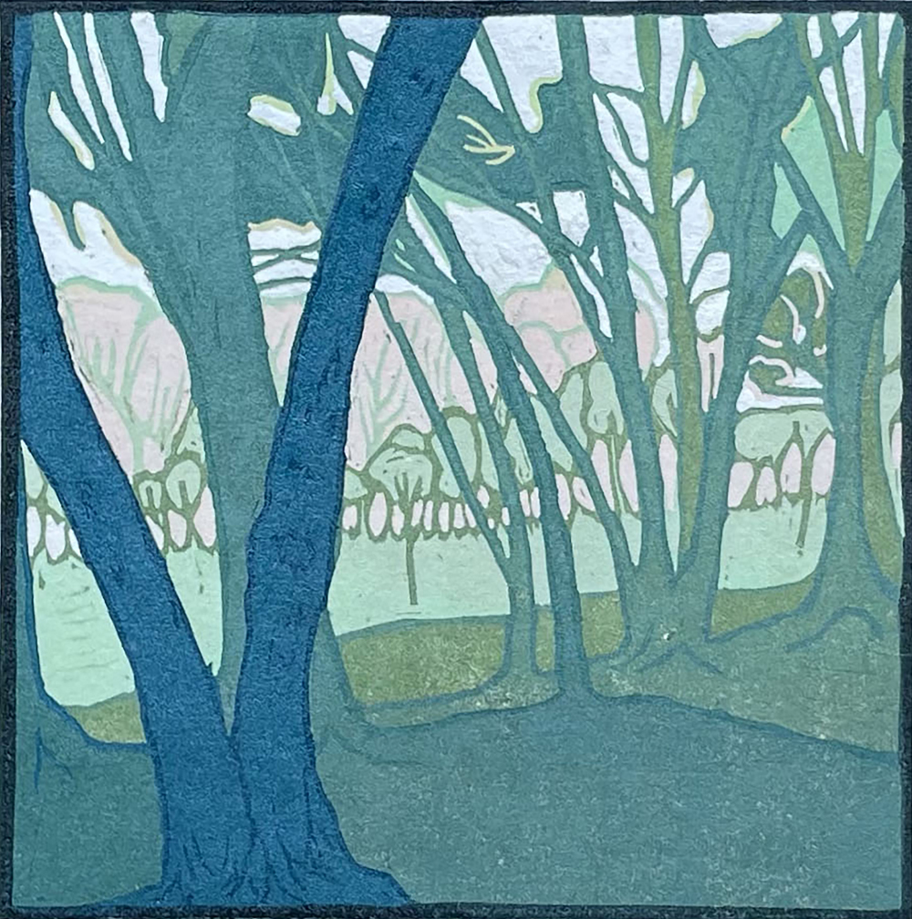 Staunton is a linocut printmaker often using reduction and multi-block techniques. Their work explores themes of restriction and the implied position of the viewer, navigating boundaries, such as branches and objects obstructing the view or trapping the viewer. Learn More